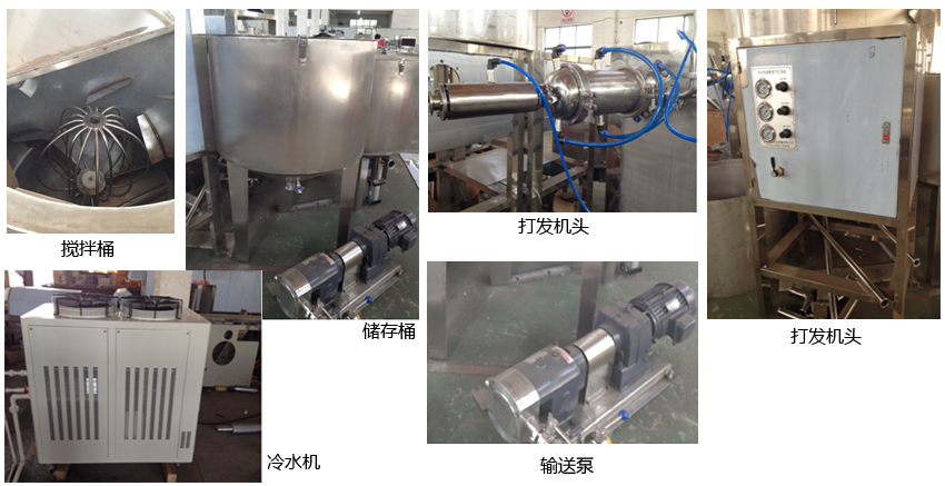 充气打发机配有冷却机一台"组合式拌料储存机一台机完全打发机一台。其中虽然冷却机噪音较小但是推介安装在室外,这样既可节约空间又安静!充气打发机可连续配料连续储存连续送料中间人员只需配料和看好设备及拌料程度直接操作触摸屏设置即可完成。中间可以节省至少4~5个人员的劳动力操作及简单又轻松。